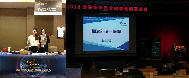 TWCERT/CC had a booth at the summit to promote cybersecurity awareness. Ms. Wen-Ling Luo, the analyst of TWCERT/CC, also gave a lecture titled as “Personal Data Exfiltration in a Moment” to introduce the causes and preventions of personal data exfiltration