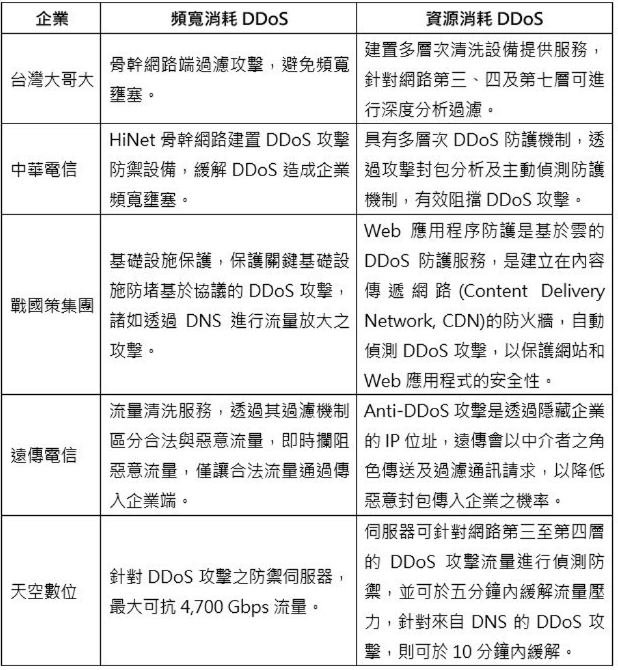 綜上所述,DDoS攻擊已成為攻擊者最常使用的攻擊手段之一,企業為避免在遭受DDoS攻擊後蒙受嚴重損失,必須建置相關防護系統和設備,以利在攻擊事件發生第一時間察覺並有效防制,減少攻擊所帶來之影響。隨著DDoS攻擊所能利用之裝置及手法類型越來越多樣化,雖然企業可自行建置防禦設備和機制,但其防禦效果如何仍存有疑慮。因此,許多國內廠商紛紛推出針對DDoS攻擊之防禦服務,全方位協助企業從裝置的選擇、安裝,到即時監控以及事件處理等工作,讓企業得以建立更為完善之DDoS攻擊防護系統與機制,可參考表1:國內企業DDoS防禦服務彙整表。