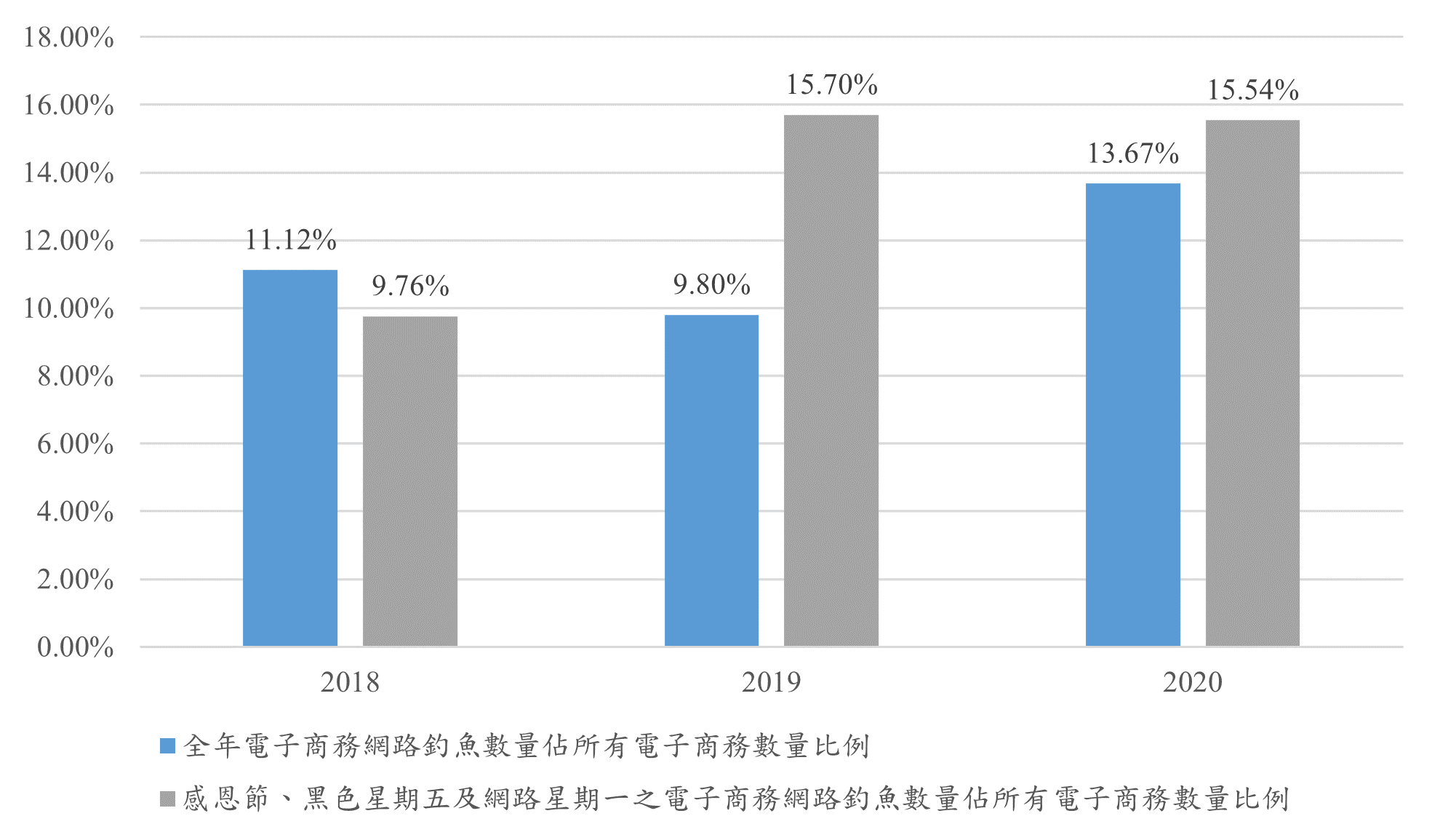 圖1、2018年至2020年之全年與購物季節網路釣魚比例統計。