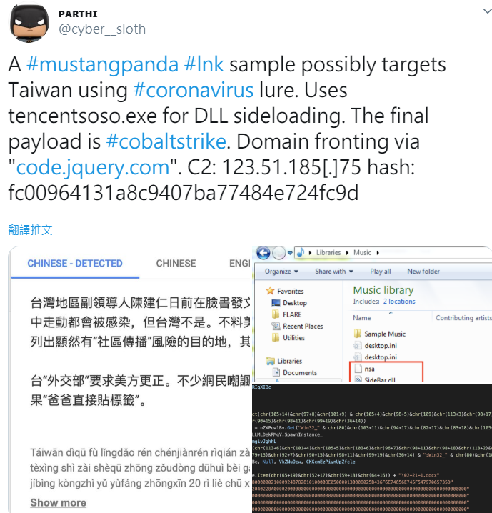 該電子郵件附檔是含有惡意程式碼的文件,透過mshta.exe執行,執行後出現冒充副總統發言的文檔以及一個惡意執行檔。惡意執行檔會執行另一個內含三個惡意檔案。執行時,該惡意檔案內的三個檔案會被放入使用者電腦的Music文件夾中,其中一個是假冒知名影音軟體名稱及圖示的檔案,藉此讓使用者信以為真誘導點擊,點擊後將會執行其他兩個惡意檔案,並連結到駭客掌控的C&C伺服器下載並植入Cobalt Strike等攻擊工具至受害者電腦,進行盜錄鍵盤和螢幕畫面,以及下載檔案等惡意行為,並成為殭屍電腦(Bot)。