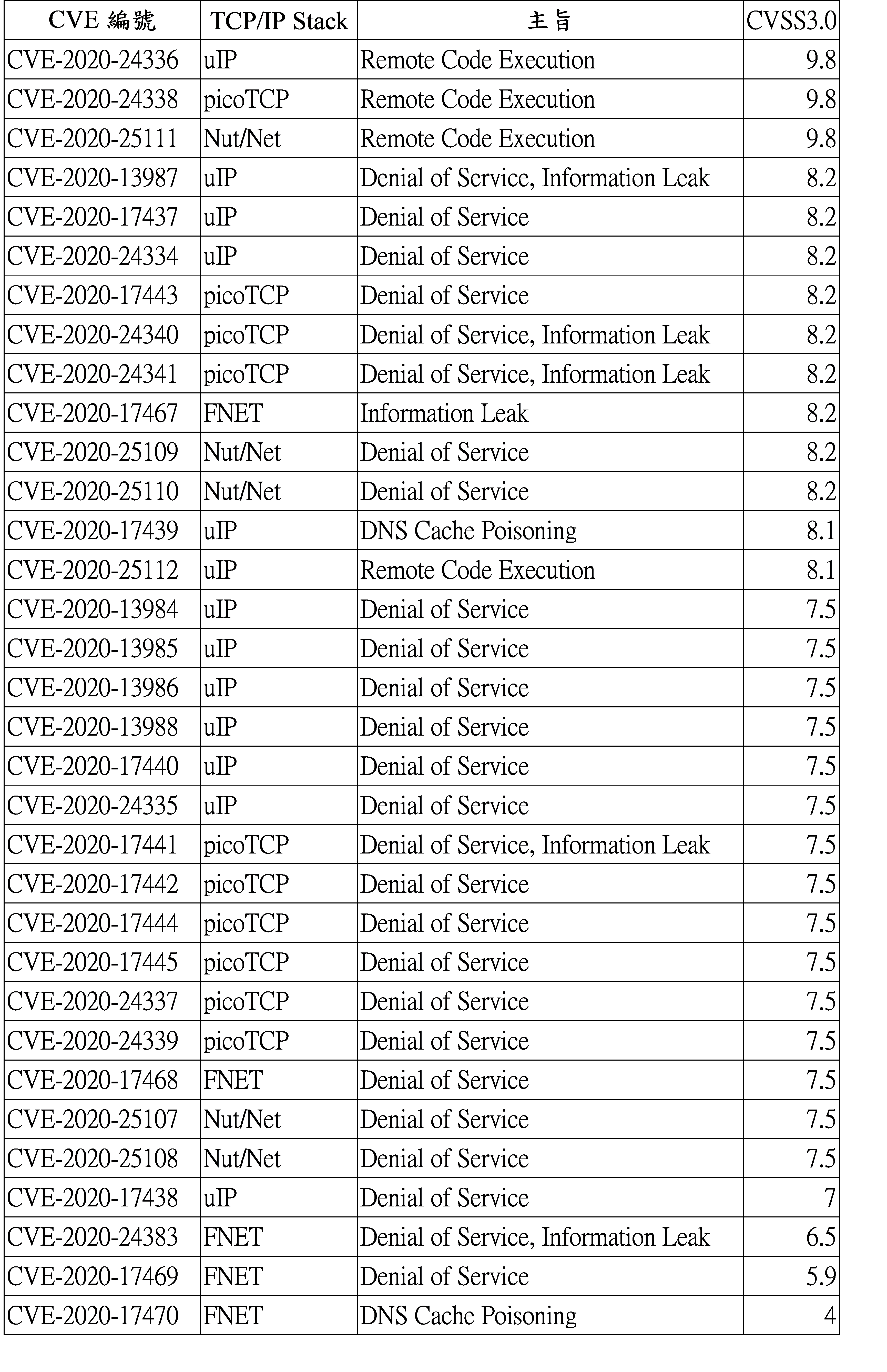 此33個漏洞因其攻擊記憶體的特性被稱為AMNESIA:33,當中包含3個CVSSv3風險等級為Critical,受影響的版本與相關CVE資訊如下: