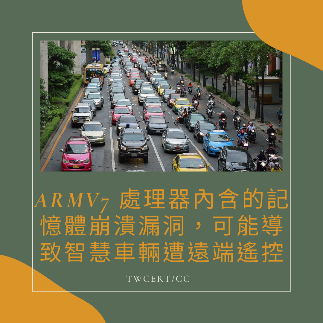 網通大廠 Cisco 的資安研究團隊,日前發表研究報告,指出一個內藏在 ARMv7 處理器中的記憶體崩潰漏洞,可能導致任何使用此處理器的裝置受到駭侵攻擊;特別是智慧汽車很可能被駭侵者遠端遙控。