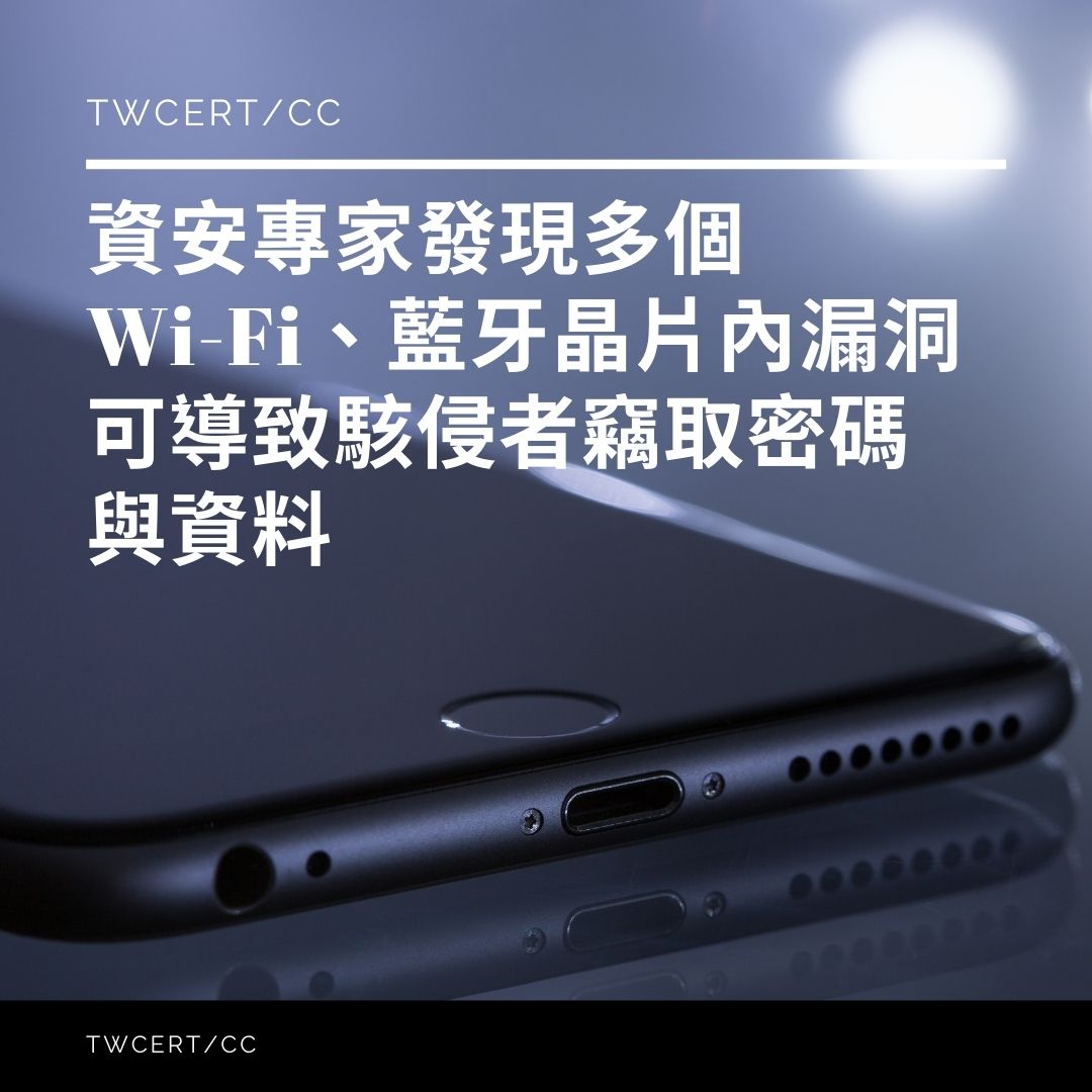 多個資安研究機構的資安專家,近期聯合發表研究報告,指出研究人員發現存於現用 Wi-Fi 與藍牙晶片中的多個資安漏洞,可導致駭侵者用於竊取裝置密碼與各種資料。
