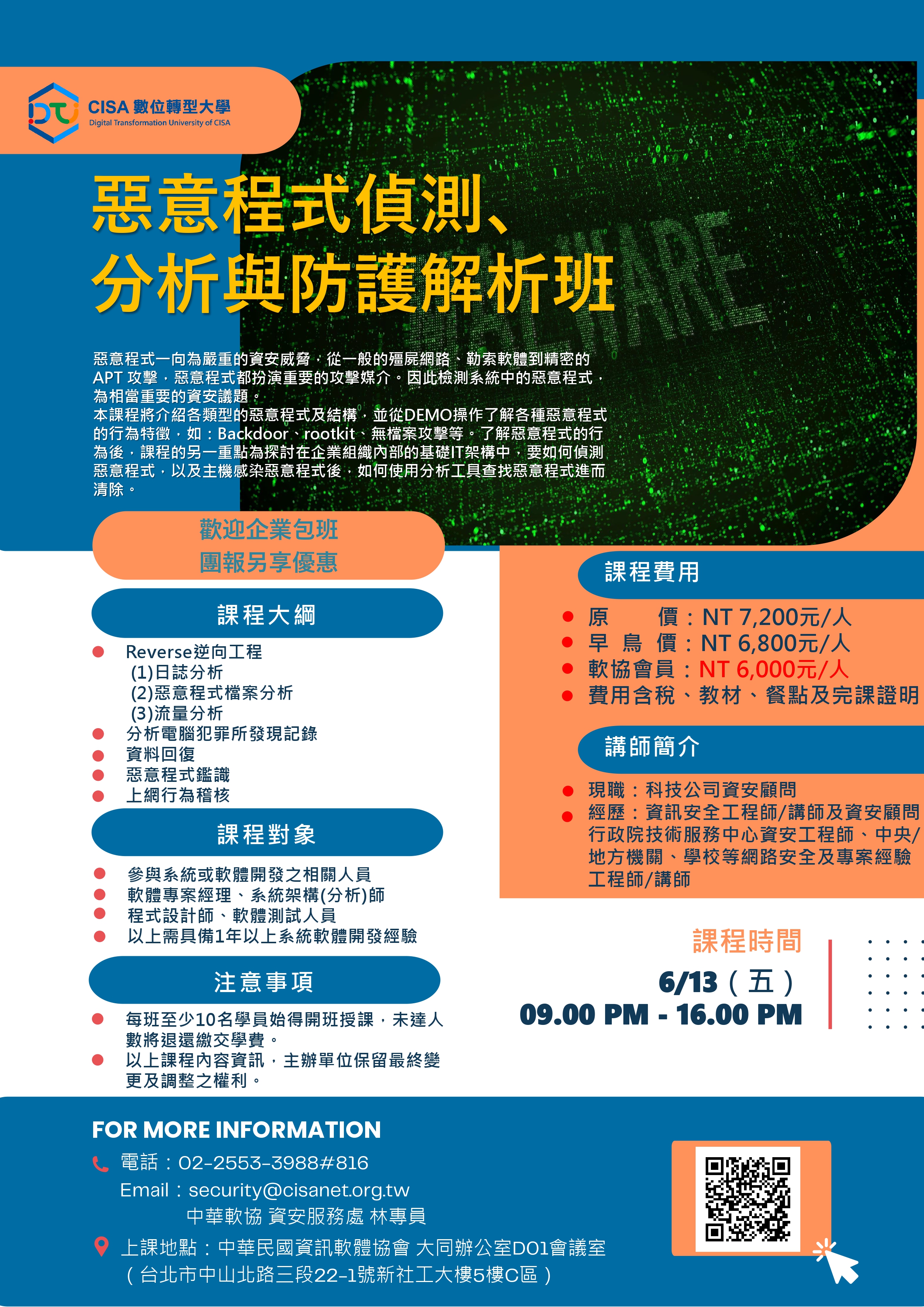 【資安學院】6/13 惡意程式偵測、 分析與防護解析班