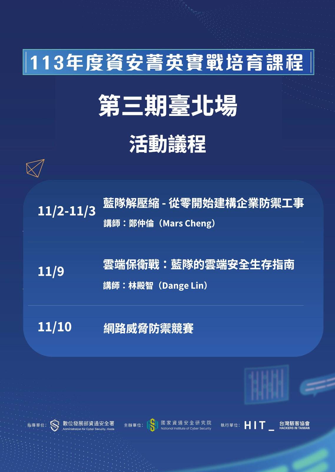 | 113年11月2日至3日(週六、週日) | 藍隊解壓縮 - 從零開始建構企業防禦工事:鄭仲倫講師 |