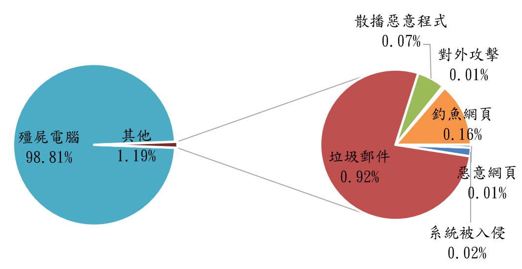 殭屍電腦98.81% 其他1.19% 垃圾郵件0.92% 系統被入侵0.02% 惡意網頁0.01% 釣魚網頁0.16% 對外攻擊0.01% 散播惡意程式0.07%