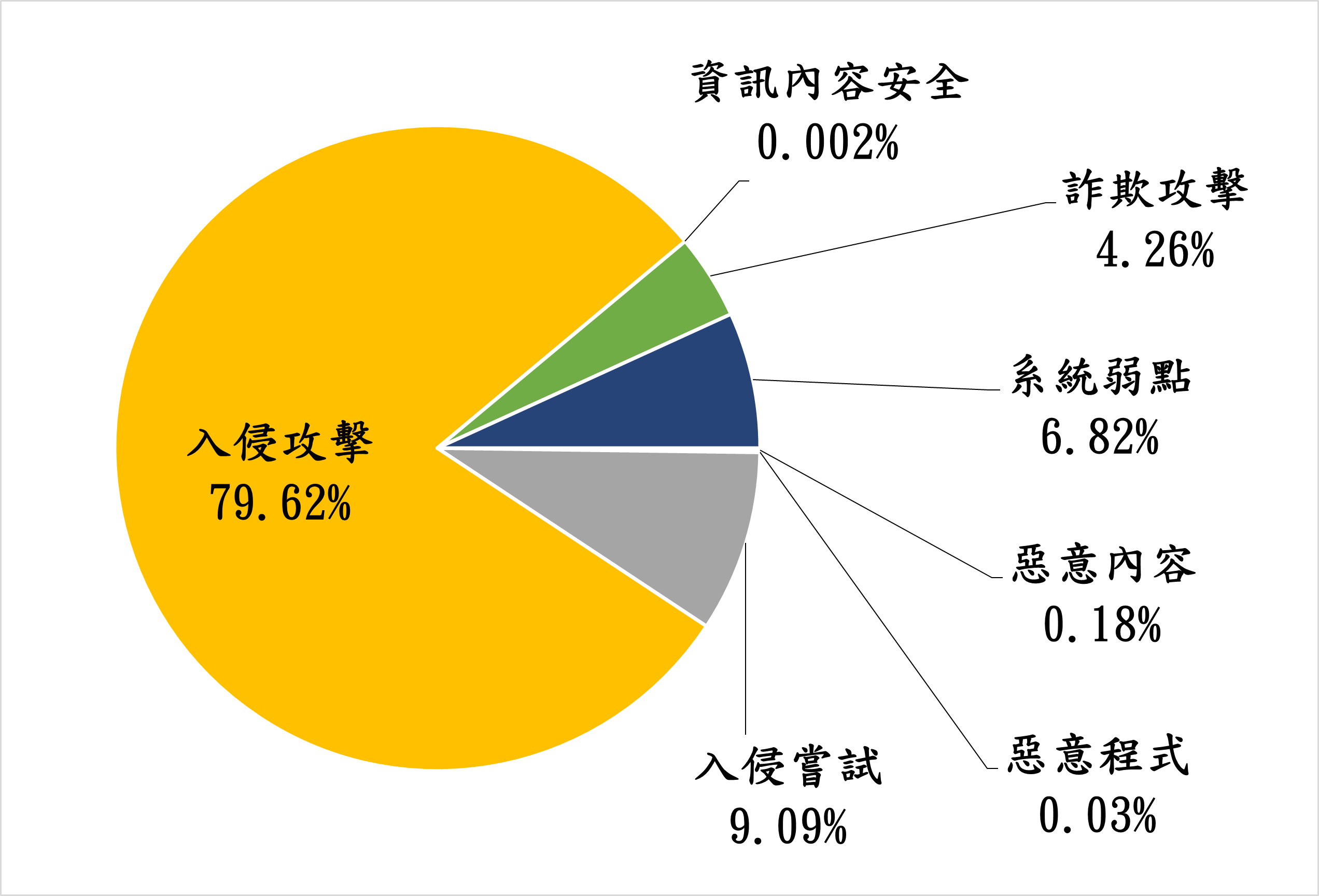 入侵攻擊79.62% 資訊內容安全0.002% 詐欺攻擊4.26% 系統弱點6.82% 惡意內容0.18% 惡意程式0.03% 入侵嘗試9.09%