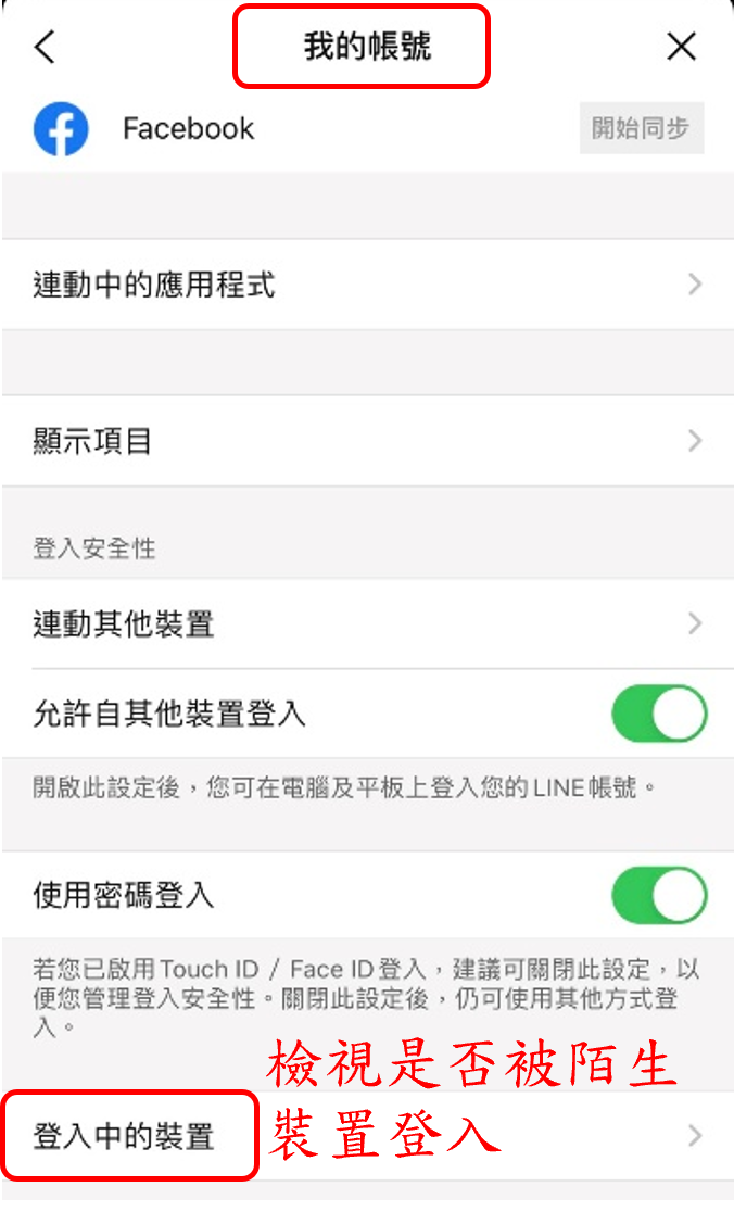 請依下列步驟檢視LINE帳號的安全性: