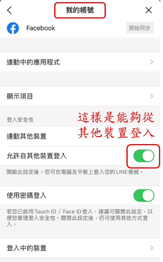 4.請至LINE app的主頁->設定(齒輪)->我的帳號,將【允許自其他裝置登入】的設定關閉。