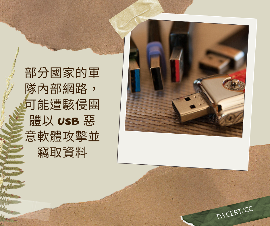 資安廠商指出,觀測到某駭侵團體以寄生於 USB 儲存裝置的惡意軟體,竊取與公眾網路相互隔離的軍隊內網資料。