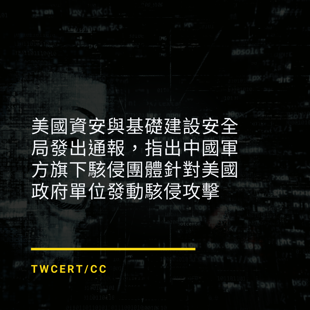 美國資安與基礎建設安全局發出通報,指出中國軍方旗下駭侵團體針對美國政府單位發動駭侵攻擊