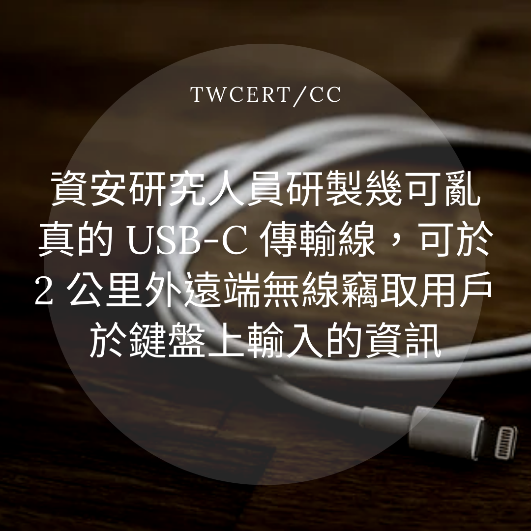 資安研究人員研製幾可亂真的 USB-C 傳輸線,可於 2 公里外遠端無線竊取用戶於鍵盤上輸入的資訊