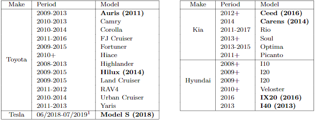 受該漏洞影響的車款,包括 Toyota 2008 年到 2016 年的 Auris、Camry、Corolla、RAV 4、Yaris、Hiace、Hilux等,KIA 2011 到 2017 年的 Carens、Soul、Picanto 等,以及 Hyundai 2008 到 2013 年的 i10、i20、IX20、Veloster 等車款。