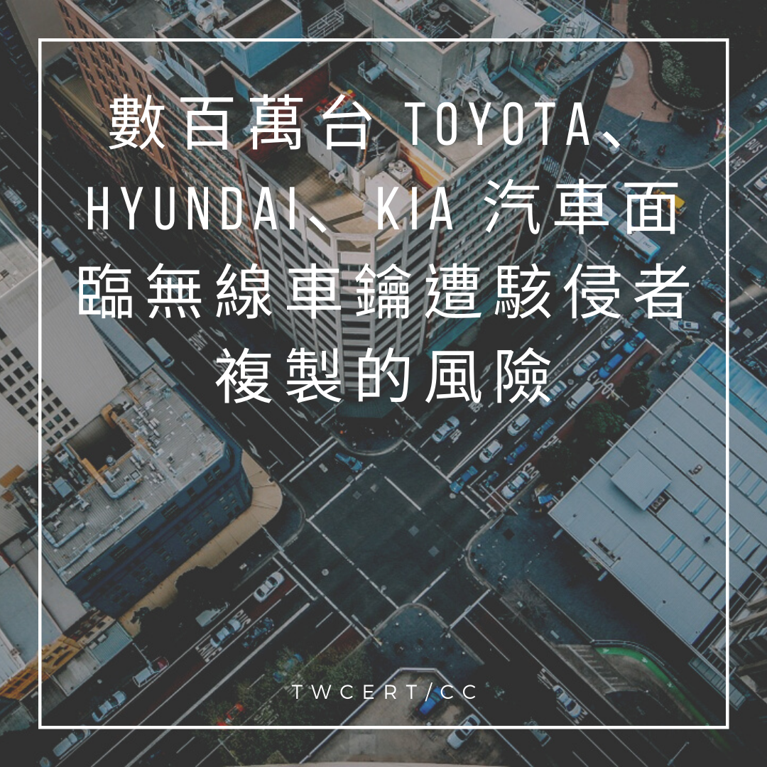 資安專家指出 Toyota、Hyundai、KIA 等三家車廠使用的無線車鑰系統,其加密演算法存有資安漏洞,駭侵者可輕易取得密鑰資訊,進而竊走車輛。