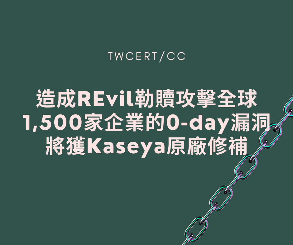 七月初由駭侵勒贖團體 REvil 針對 Kaseya VSA(Virtual System/Server Administrator) 伺服器平台發動的全球性勒贖攻擊活動,所使用的 0-day 資安漏洞,即將在近日由 Kaseya 推出修補程式予以修補。