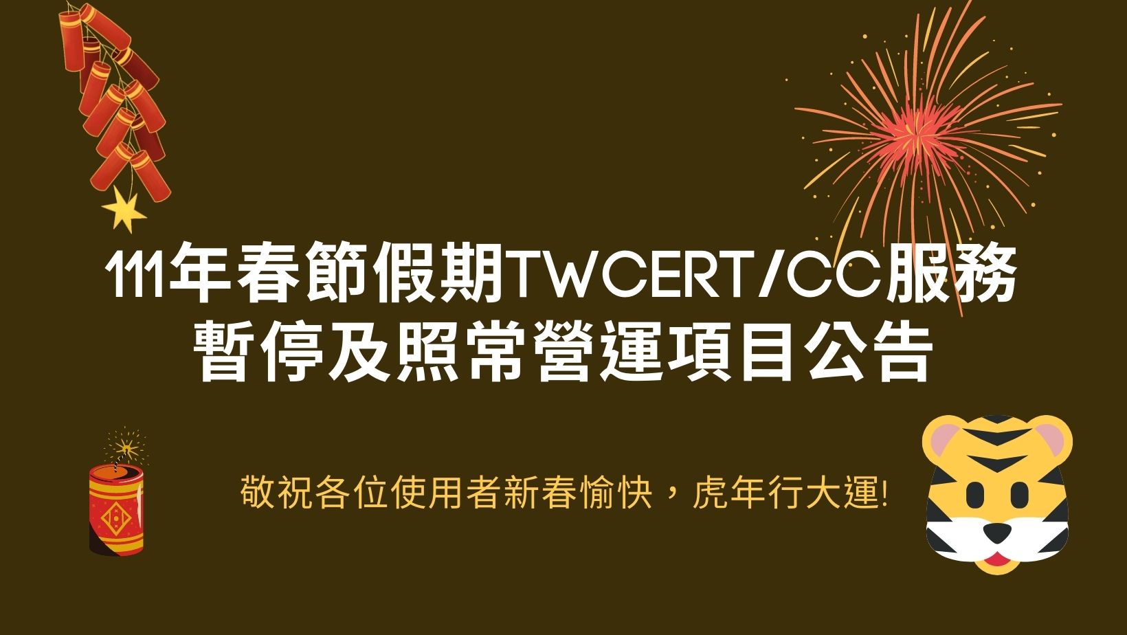 一、本年度農曆春節休假期間為民國111年1月31日(一)至2月4日(五),此期間TWCERT/CC將暫停以下服務: