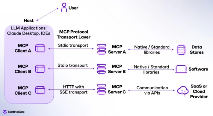圖1: 用戶端和伺服器端於MCP架構中的通訊。圖片來源:SentinelOne