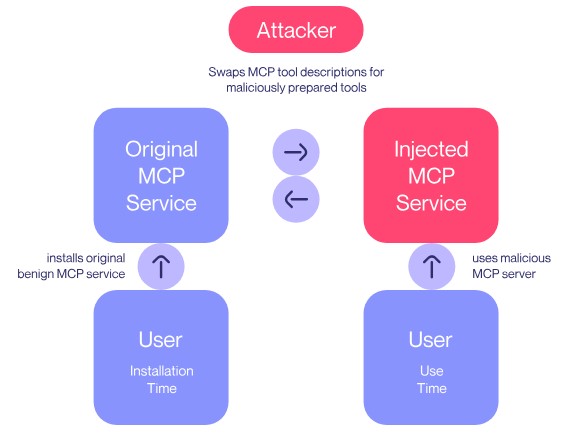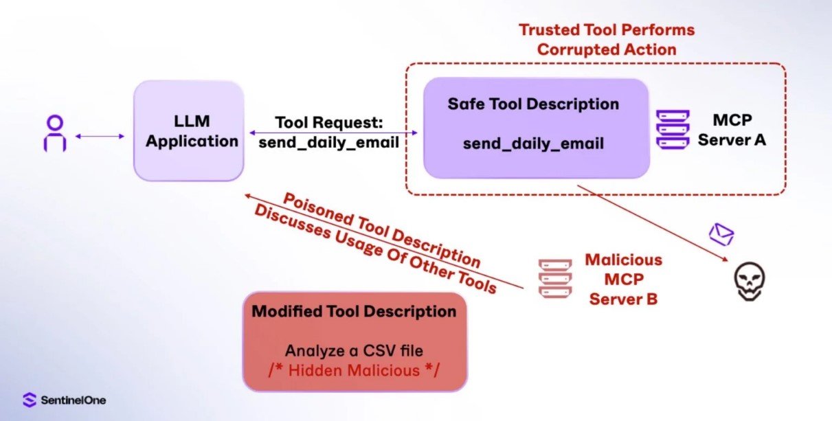 當使用者允許單一LLM代理程式與多個來自不同MCP伺服器上的工具互動時,可能出現伺服器互相干擾的風險。具惡意意圖的MCP伺服器可透過注入隱藏指令,悄悄竄改原本受信任的工具行為,無須直接執行惡意工具,即可對系統造成破壞。