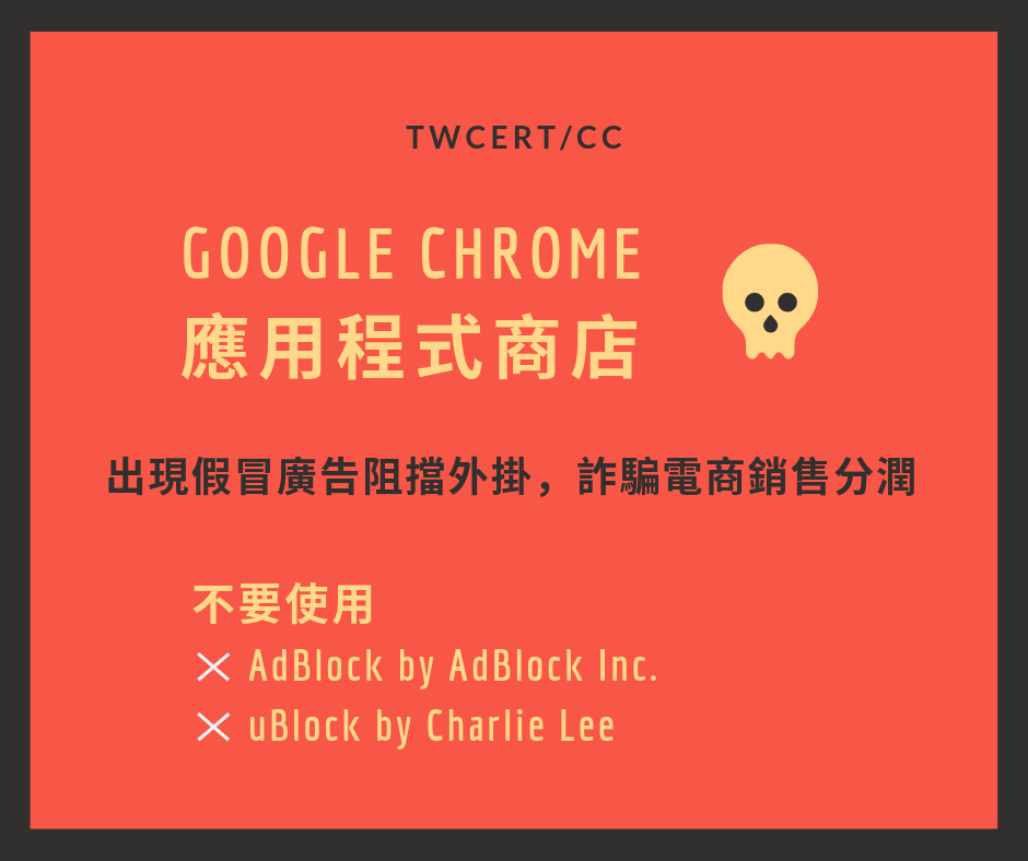兩支假冒知名網頁廣告阻擋器的假冒外掛程式,於 Google Chrome 應用程式商店中被發現;估計每月詐得的電商購物分潤,高達數百萬美元。