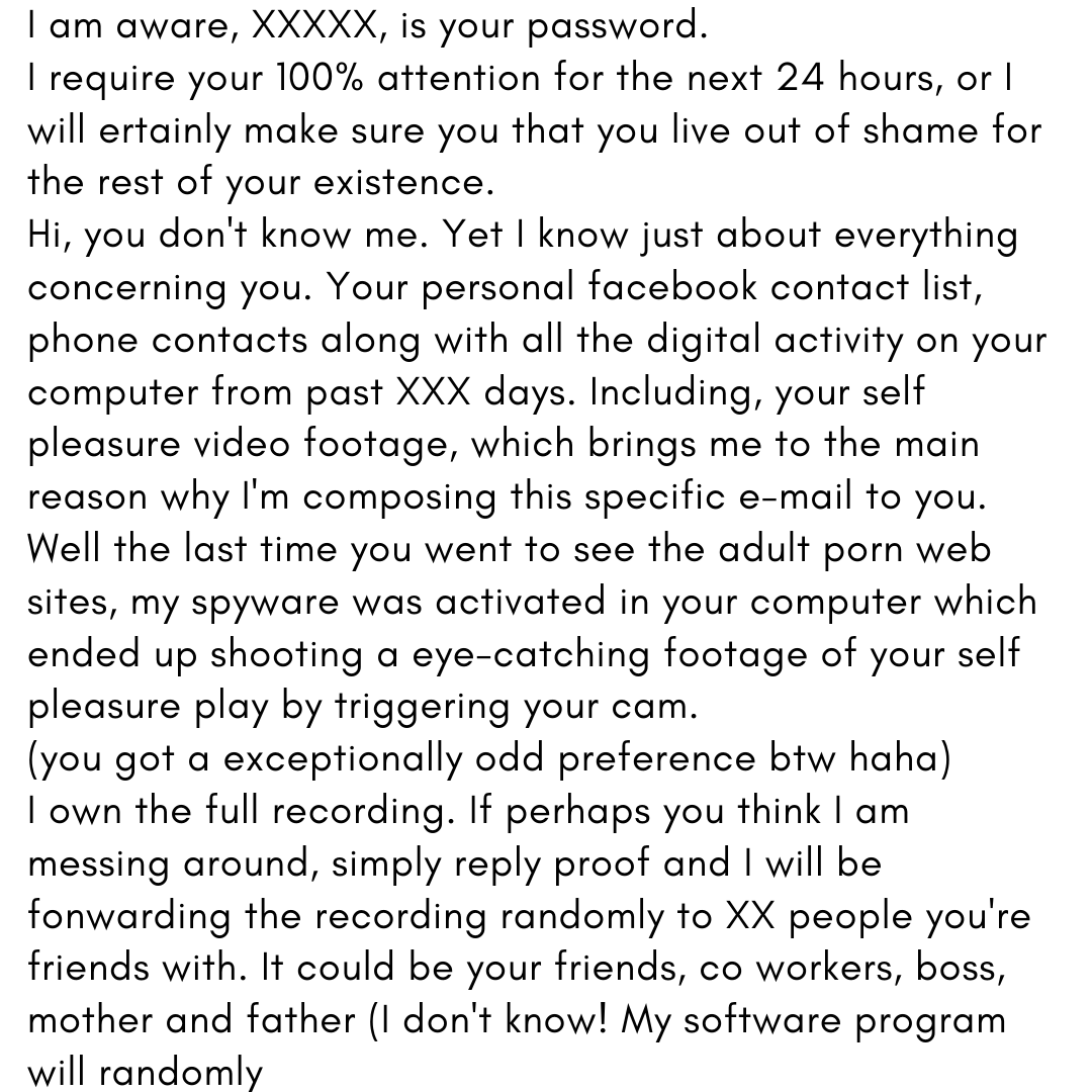 1、郵件開頭為Your password is XXXX.或是I am aware, XXXX, is your password.可能隨機更換。