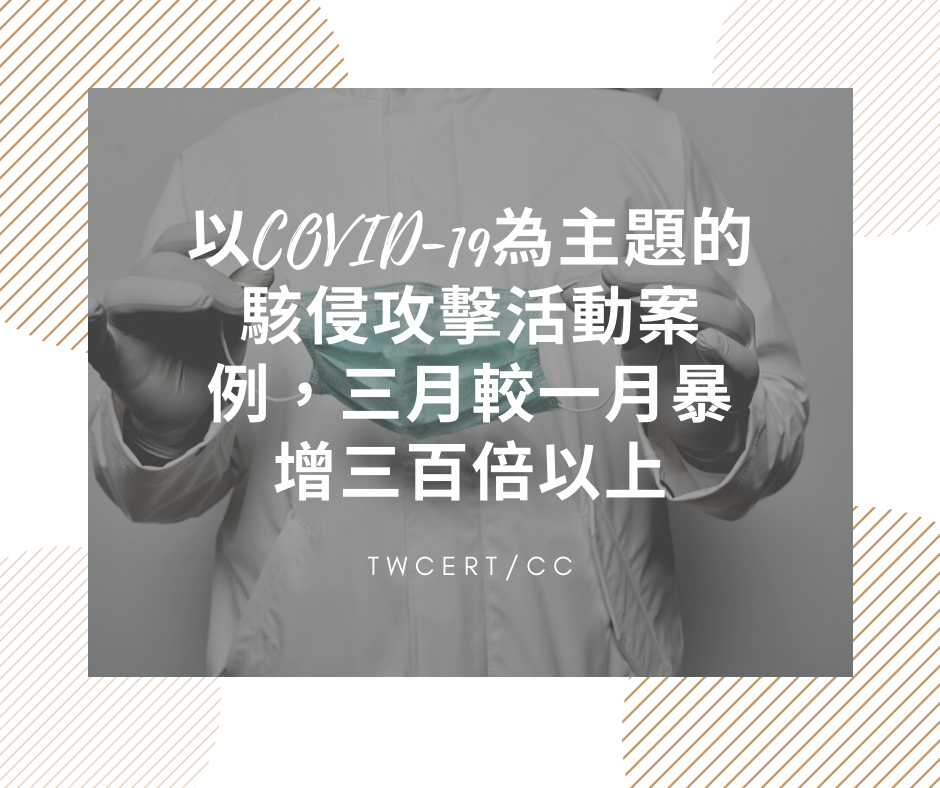 資安廠商指出,以COVID-19(新冠肺炎、武漢肺炎)為主題的駭侵攻擊案例數量,今年三月份較一月份增加了三百倍之多。