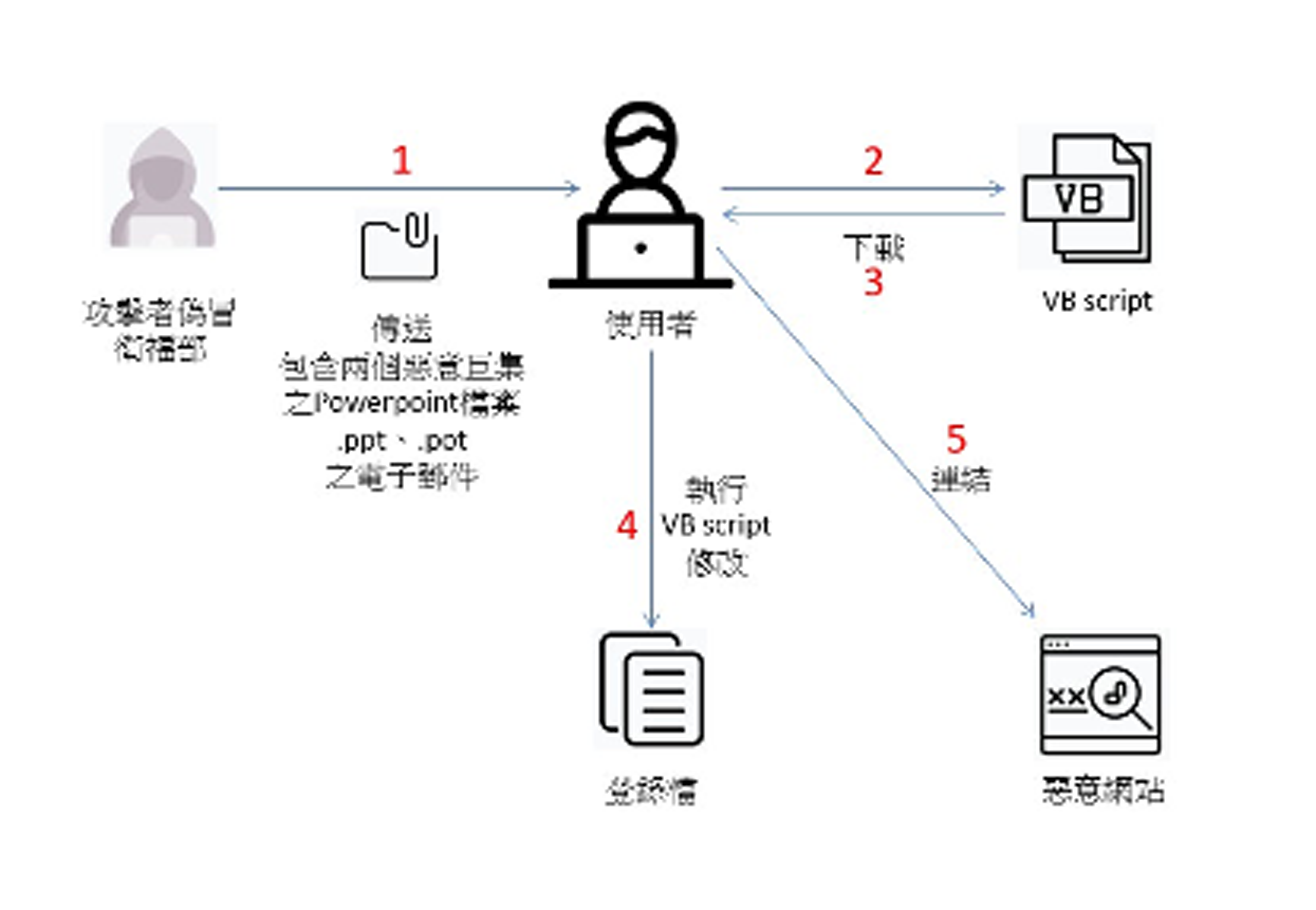 近來發現多起針對科技公司的網路釣魚郵件攻擊,駭客假冒衛福部之名義發送標題為「免費分發covid-19防護設備(台灣衛生部)」之釣魚郵件,引誘使用者點擊信件且於信件中夾帶2個含有惡意巨集(Marco)的PowerPoint檔案,當使用者開啟該惡意PowerPoint檔案,會透過巨集指令連線到惡意網站,下載惡意VBScript再透過VBScript修改受害電腦的登錄檔藉此發動惡意行為。