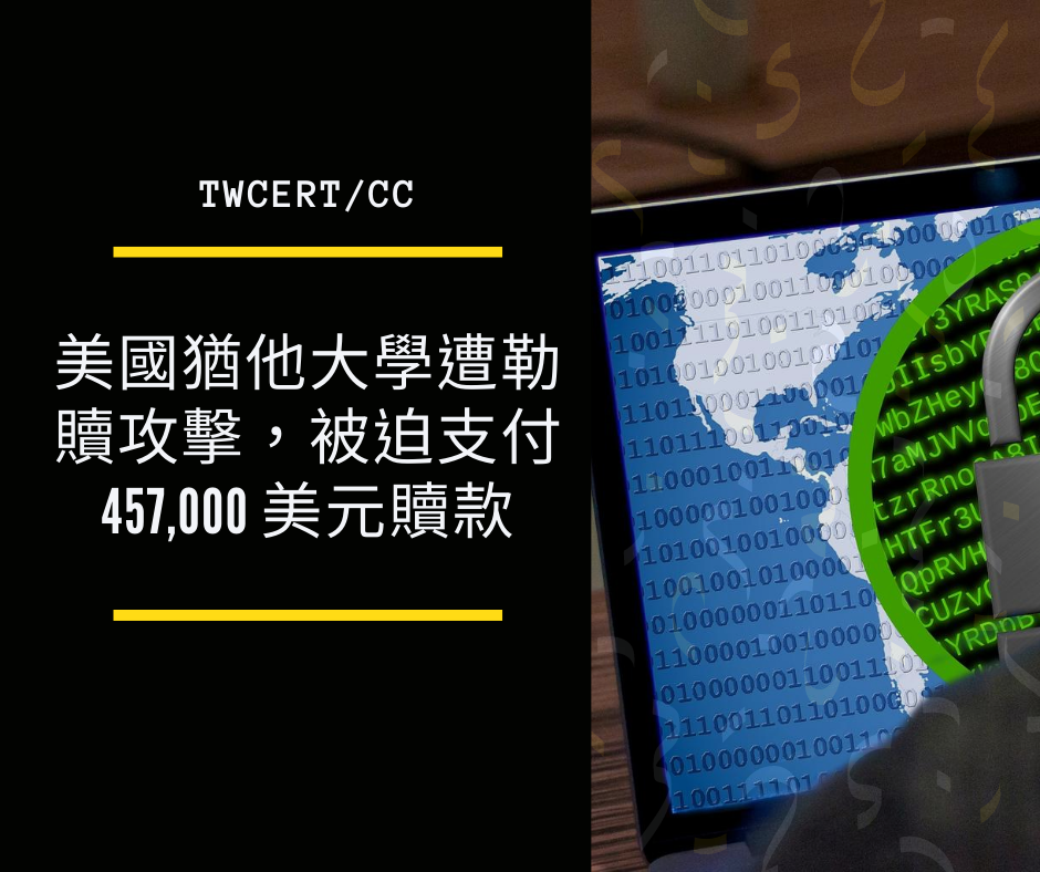 美國猶他大學日前發表資安通報,指出該校於今年七月時遭勒贖攻擊;為避免校內重要資料遭駭侵者公開,猶他大學被迫支付高達 457,000 美元的贖款。