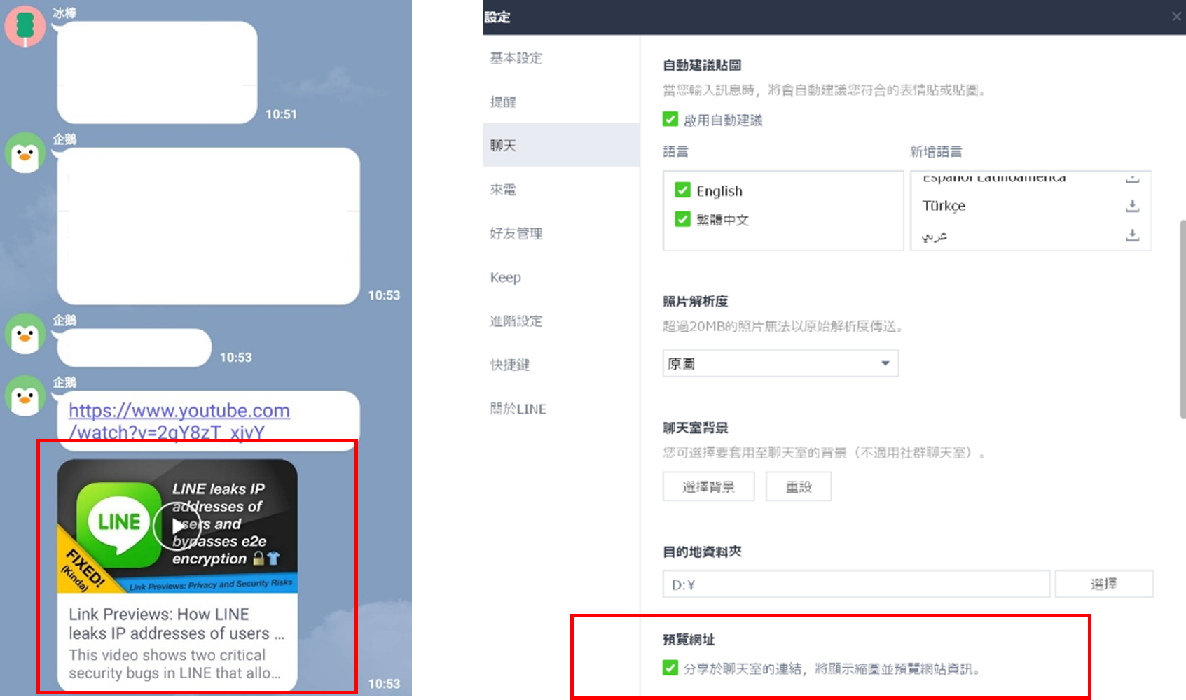 建議社群軟體相關用戶,關閉預覽網址功能,例如LINE可至「設定」→「聊天」→取消勾選「預覽網址」,以避免遭受資安攻擊而造成損失。
