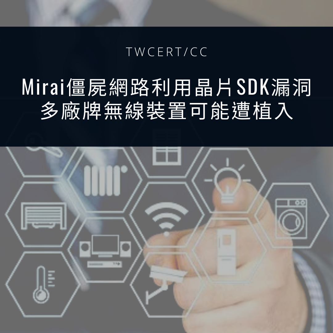 資安專家發現採用台灣網通大廠之硬體與其 SDK 的無線連網裝置,含有一系列嚴重資安漏洞,且該漏洞已遭 Mirai 僵屍網路鎖定,發動大規模感染,造成數千萬台各廠牌連網裝置曝險。