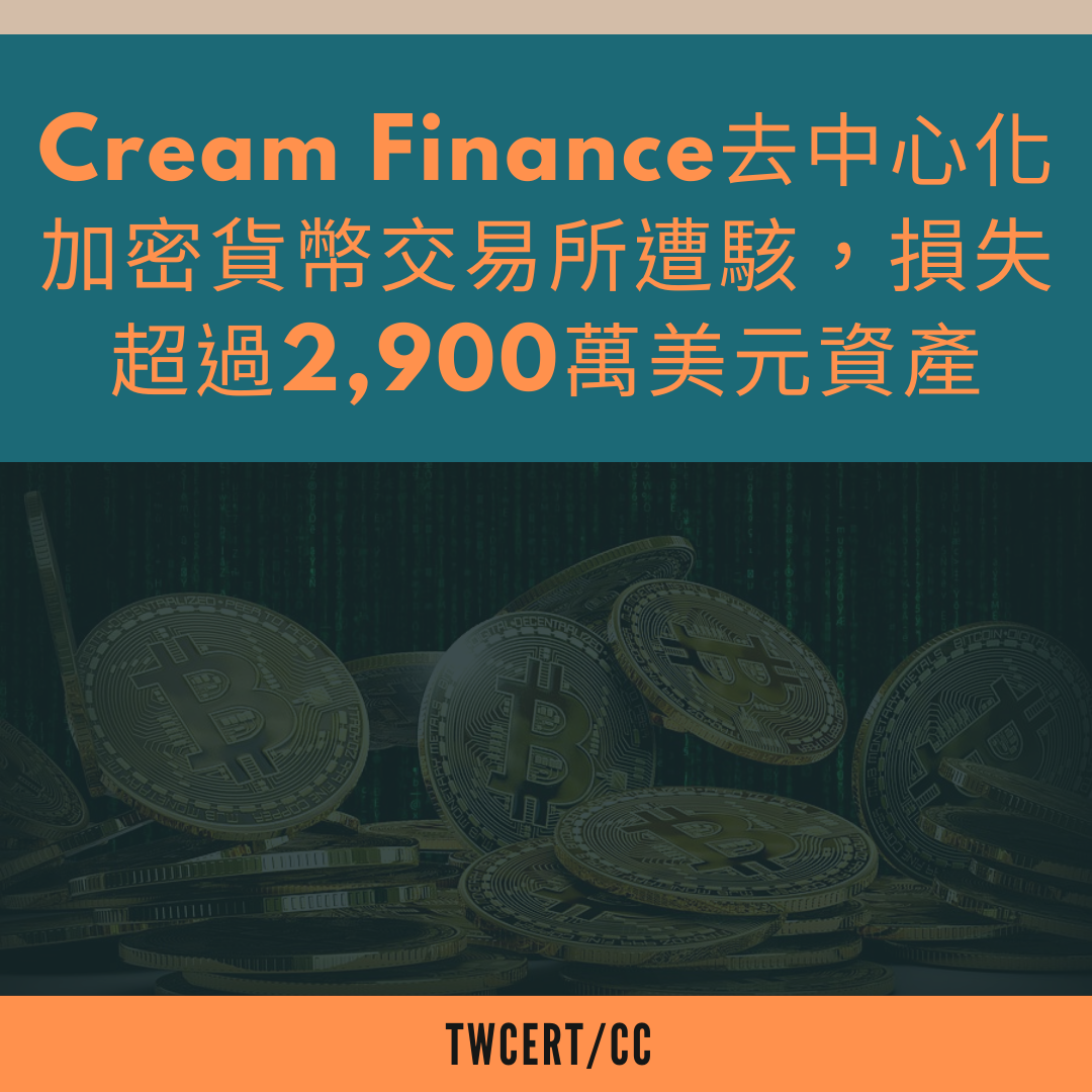 去中心化加密貨幣交易所 Cream Finance,於 8 月 30 日在 Twitter 貼文公布,該交易所遭不明駭侵者入侵,一共竊走價值超過 2,900 萬美元的資產。