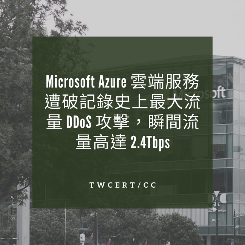 Microsoft Azure 雲端服務日前發表資安通報,指出該服務於今(2021年)8 月時遭到破記錄的強大分散式服務阻斷(Distributed Denial of Service, DDoS)攻擊,瞬間最大資料流量高達每秒 2.4Tbps;所幸系統成功抵擋這波攻擊,客戶的網站和數位服務並未受到影響。