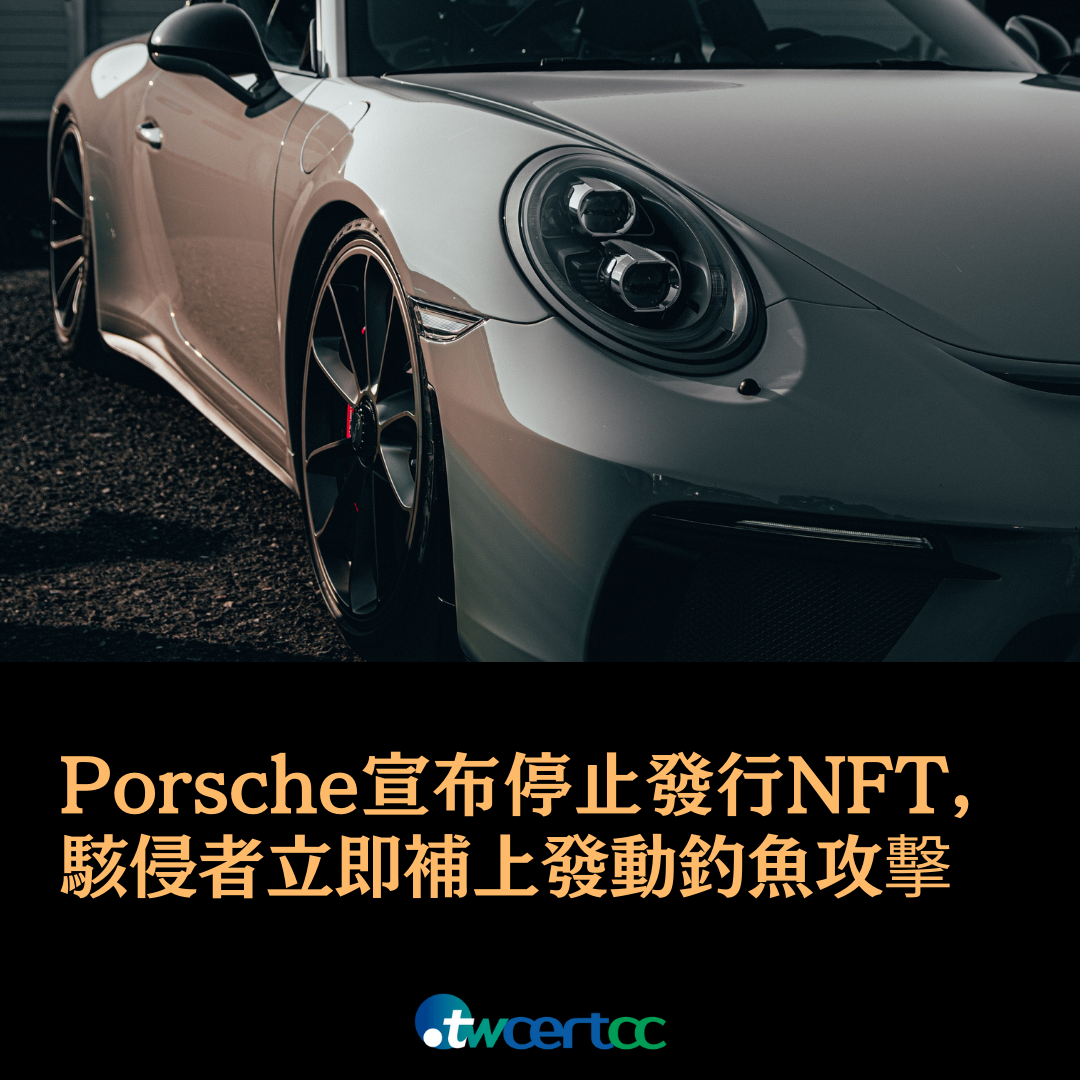 德國汽車大廠 Porsche(保時捷) 日前突然宣布停止發行一款紀念 NFT,且不再鑄造新的 NFT 後,詐騙者立刻設立多個偽裝為 Porsche 官方 NFT 網站的釣魚網站,誘騙欲購者上當後,再以惡意軟體植入受害者裝置,竊取受害者錢包內的加密貨幣。