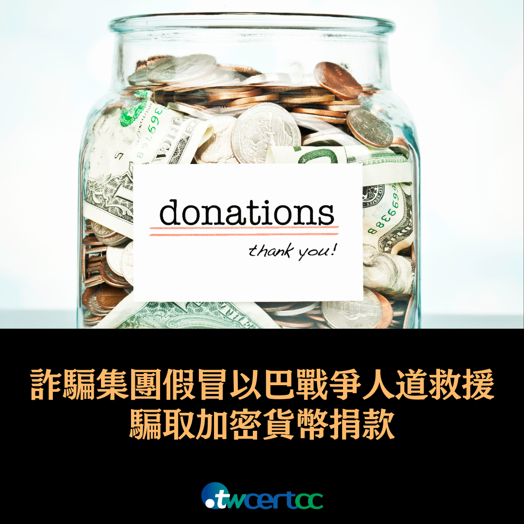 另外,也有詐騙分子假冒為以色列方的人道救援組織,以類似手法企圖騙取愛心捐款;所幸到目前為止均無任何人捐款。