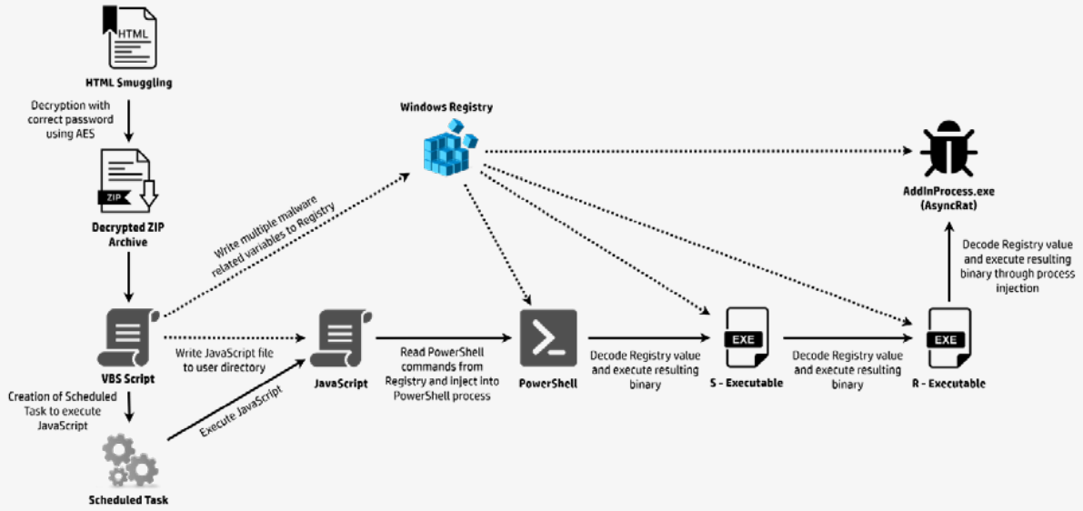 圖 1 為此次事件的攻擊鏈,首先,駭客透過釣魚信件夾帶一個HTML檔案,當受害者開啟HTML檔案時,即觸發由VBScript寫的惡意腳本,該腳本將惡意程式相關的資料寫入註冊表,並在受駭者的資料夾中創建一個JavaScript腳本。接者,透過工作排程實現持久化並執行JavaScript惡意腳本。JavaScript 腳本會讀取先前寫入註冊表的資料,以執行Powershell腳本內容,最後,Powershell腳本會解碼在註冊表中的資料,獲取最終駭客想要執行的惡意程式AsyncRAT。