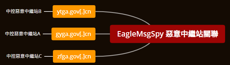 追蹤EagleMsgSpy的過程中,Lookout研究人員發現惡意中繼站所使用的IP位置曾與武漢中企軟通科技有限公司的子網域有關聯,後續調查該中國企業使用的根網域為tzsafe.com,其中字串tzsafe是間諜軟體的監控模組密碼,因此分析人員認為此間諜軟體是由武漢中企軟通科技有限公司所開發和維護。圖2是整理Lookout研究人員發現該間諜軟體所使用的惡意中繼站之關聯圖。