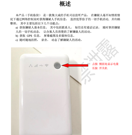 該間諜軟體主要目的為竊取Android手機上面的資料,包含通訊軟體的訊息(QQ、Telegram、Viber、WhatsApp、微信)、監控螢幕畫面、通話紀錄、簡訊、聯絡人資訊、GPS座標位置、無線網路資訊、瀏覽器書籤等。資料被竊取後,首先存放於設備檔案系統中的隱藏資料夾,再壓縮並加密傳送至惡意中繼站。圖1為Lookout 研究人員發現針對此間諜軟體的說明文件,內容包含安裝設備和使用。