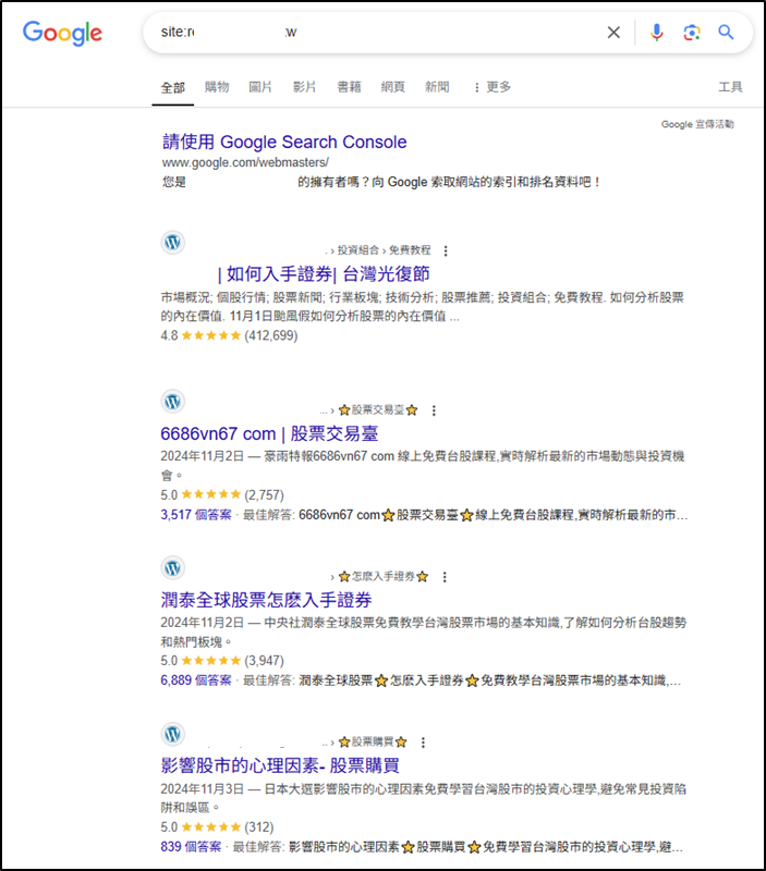 近期觀察發現搜尋引擎最佳化中毒(SEO Poisoning)攻擊事件增加,當使用者搜尋特定關鍵字和網址時,可發現大量與賭博和投資相關可疑內容。初步調查,相關內容疑似源自攻擊者入侵合法網站,並透過操控搜尋引擎排名,將惡意網站推至搜尋結果頂端,誘導使用者誤點連結,最終可能導致下載惡意程式或洩露個人敏感資料。