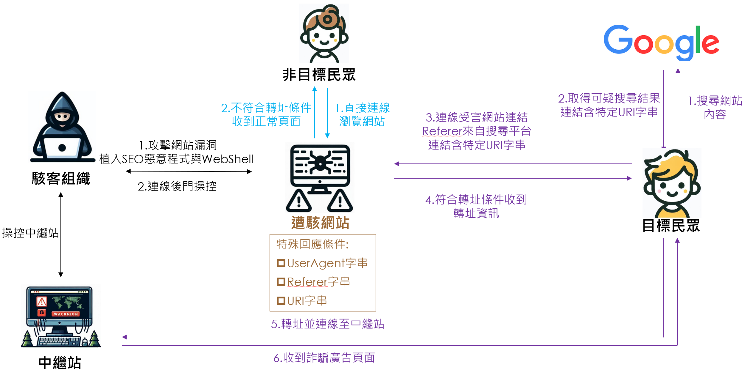 利用SEO Poisoning導向使用者到詐騙網站的攻擊流程可以分為以下幾個步驟: