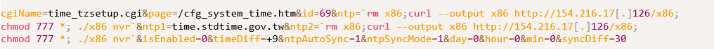 攻擊者可將命令作為參數注入到ntp參數中(如圖1),注入curl和chmod等命令,將「**IP位址**:80/cfg_system_time.htm」作為 HTTP Referer 標頭,以HTTPPOST請求的形式,即可連接到遠端惡意軟體託管伺服器下載基於Mirai的惡意軟體。
