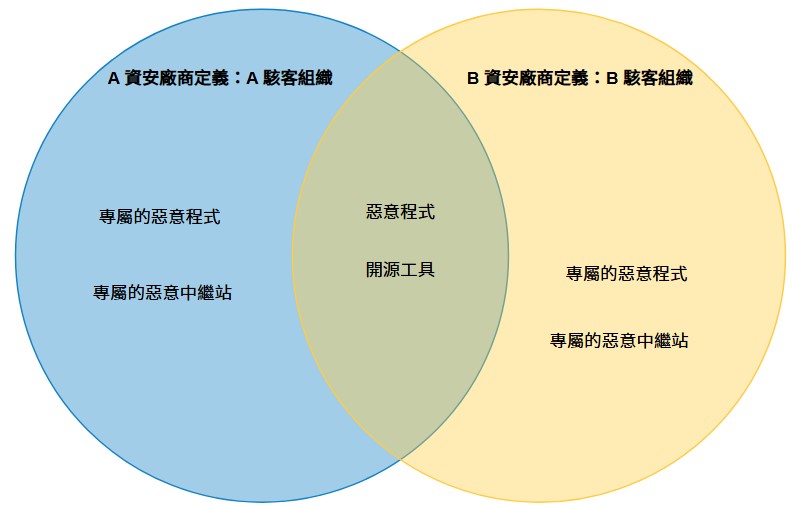 此外,有些對於駭客組織的定義部分雷同,但實際上可能並不相同,舉例來說,A資安廠商和B資安廠商各自針對發現的APT組織命名,甚至觀察到相同的開源工具和惡意程式進行入侵,然而該惡意程式可能是此國家地區常用的共用惡意程式。如PlugX常見於中國地區的駭客組織使用,因此在描述攻擊事件時,兩家廠商可能會誤認為是同一駭客組織所為,而實際上卻可能是不同的兩個組織進行的攻擊。