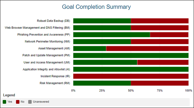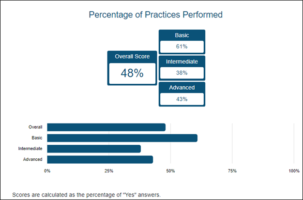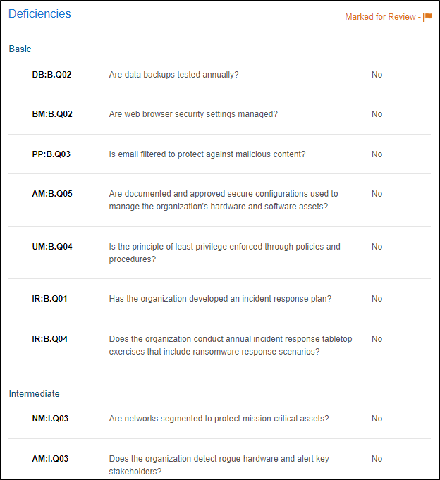 RRA評估項目分為‘Basic’、‘Intermediate’與‘Advanced’三個成熟度等級,旨在提供組織了解目前各等級防護成熟度與改善措施之優先度。建議會員可依序完成‘Basic’等級之所有措施之後再持續完善‘Intermediate’與‘Advanced’之防護措施。相關各等級對應之問題可於‘Deficiency Report’中檢視,建議措施細節可參照‘RRA report’。