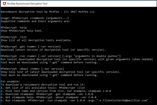 Mr2 為McAfee開發之解密工具,採取指令列介面,且定期更新支援的勒索軟體主類。使用者可透過圖13下載安裝Mr2 (綠框處),執行後可透過指令檢視支援解密的勒索軟體列表與進行解密,如圖14所示。