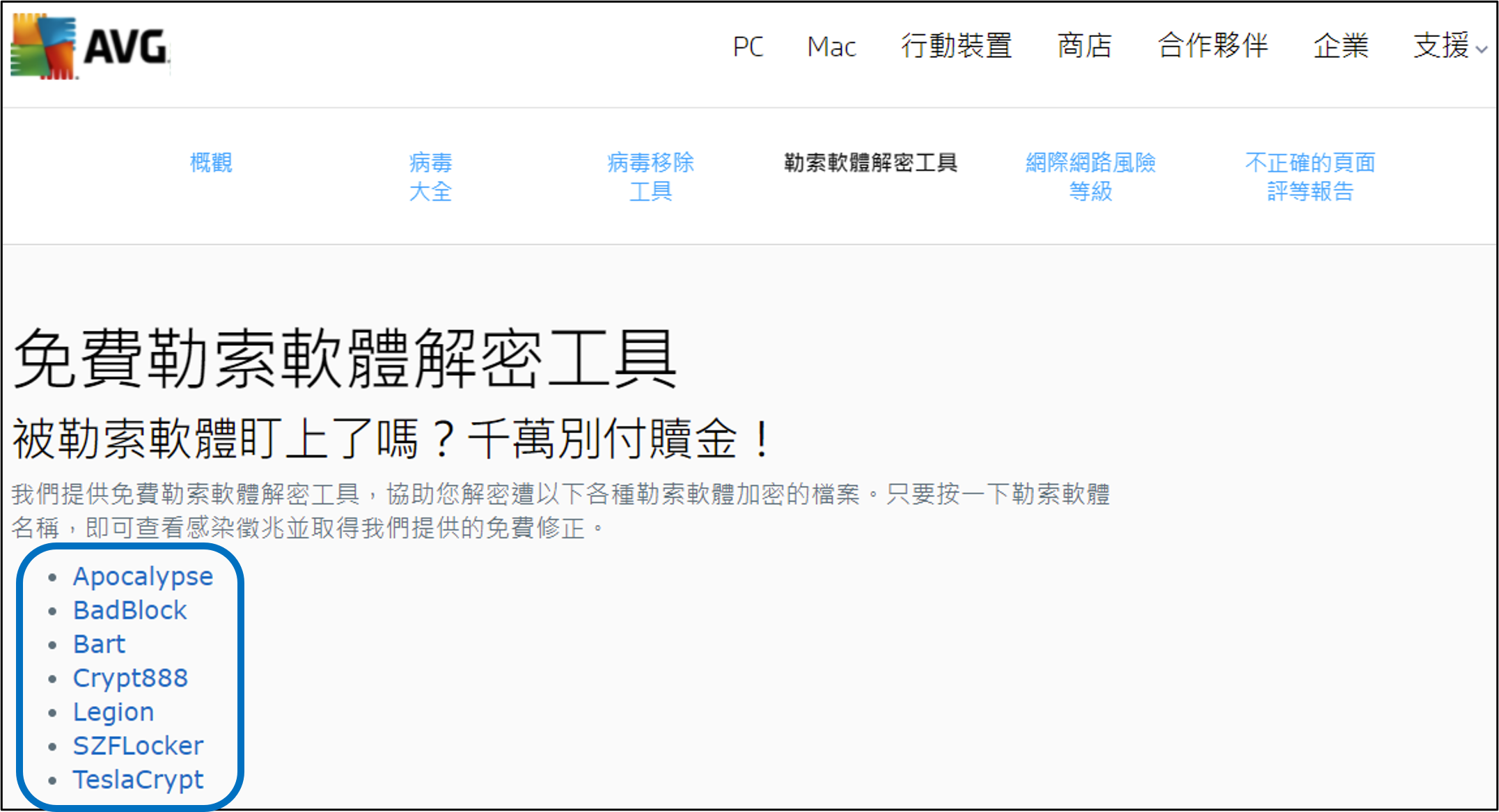 圖10、AVG免費勒索軟體解密工具列表頁面