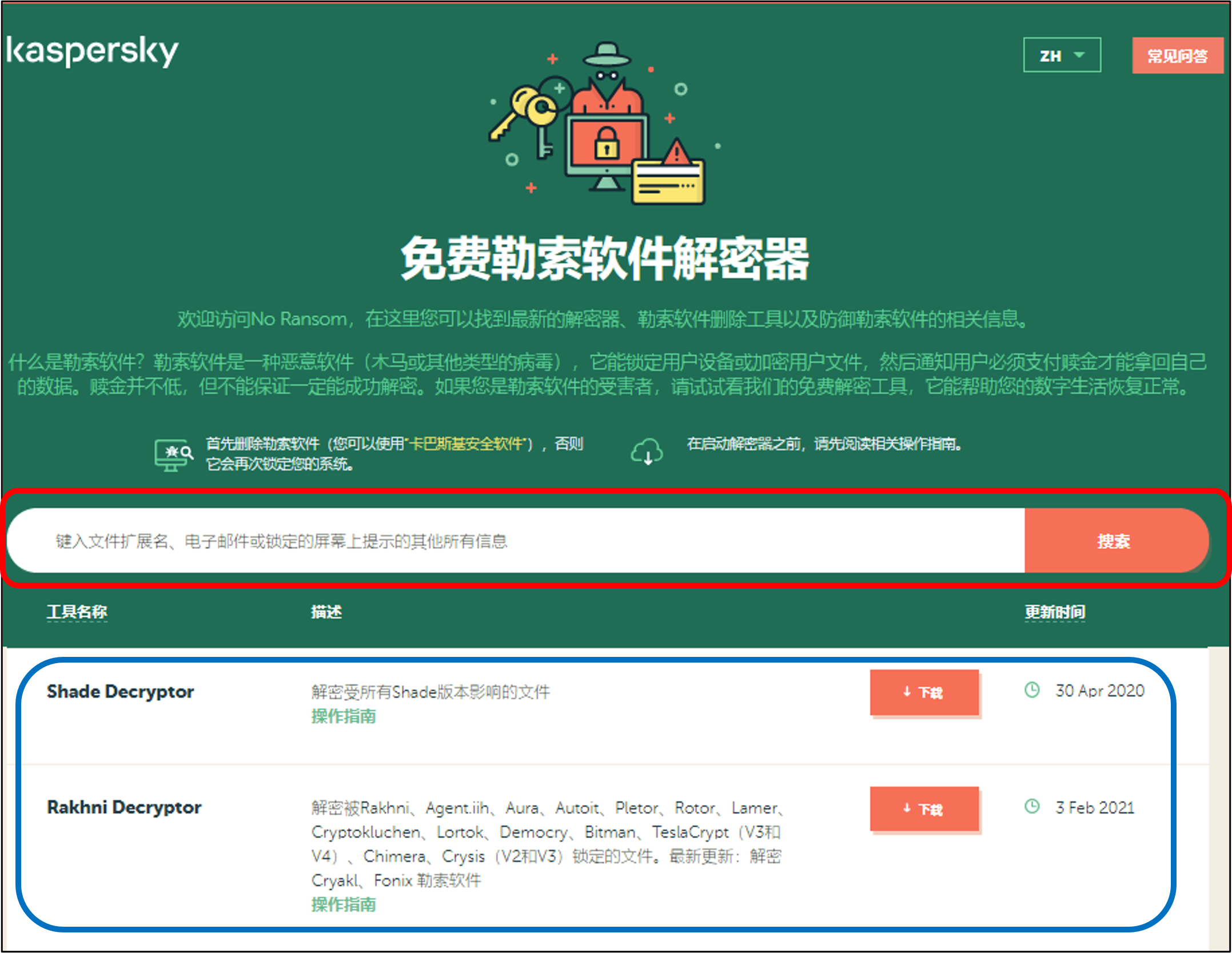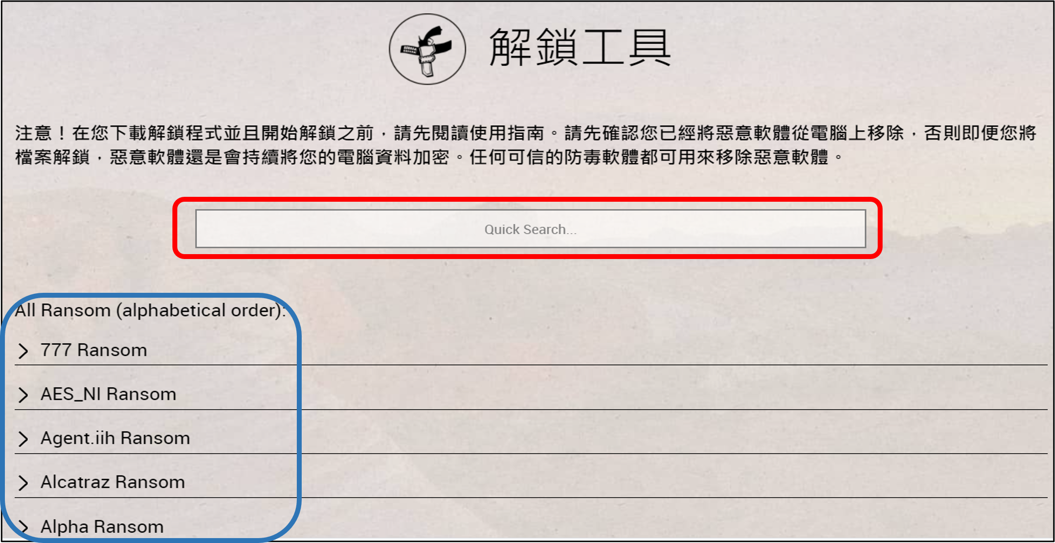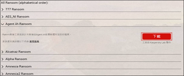 由卡巴斯基提供。使用者可瀏覽解密工具列(藍框處)表或是搜尋名稱(紅框處),下載所需之解密工具進行解密。搜尋畫面與列表如圖9所示。