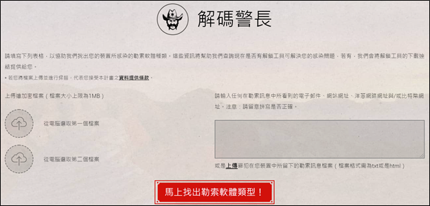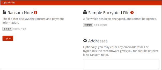 由The No More Ransom Project提供,可辨識勒索病毒並提供對應的免費解密工具。使用者可透過上傳兩個加密檔案、上傳勒索訊息檔案或是提供勒索訊息內容的電子郵件、網站網址、洋蔥網路網址、比特幣網址,即可進行辨識。上傳網頁介面如圖3所示。結果示意圖如圖4所示。