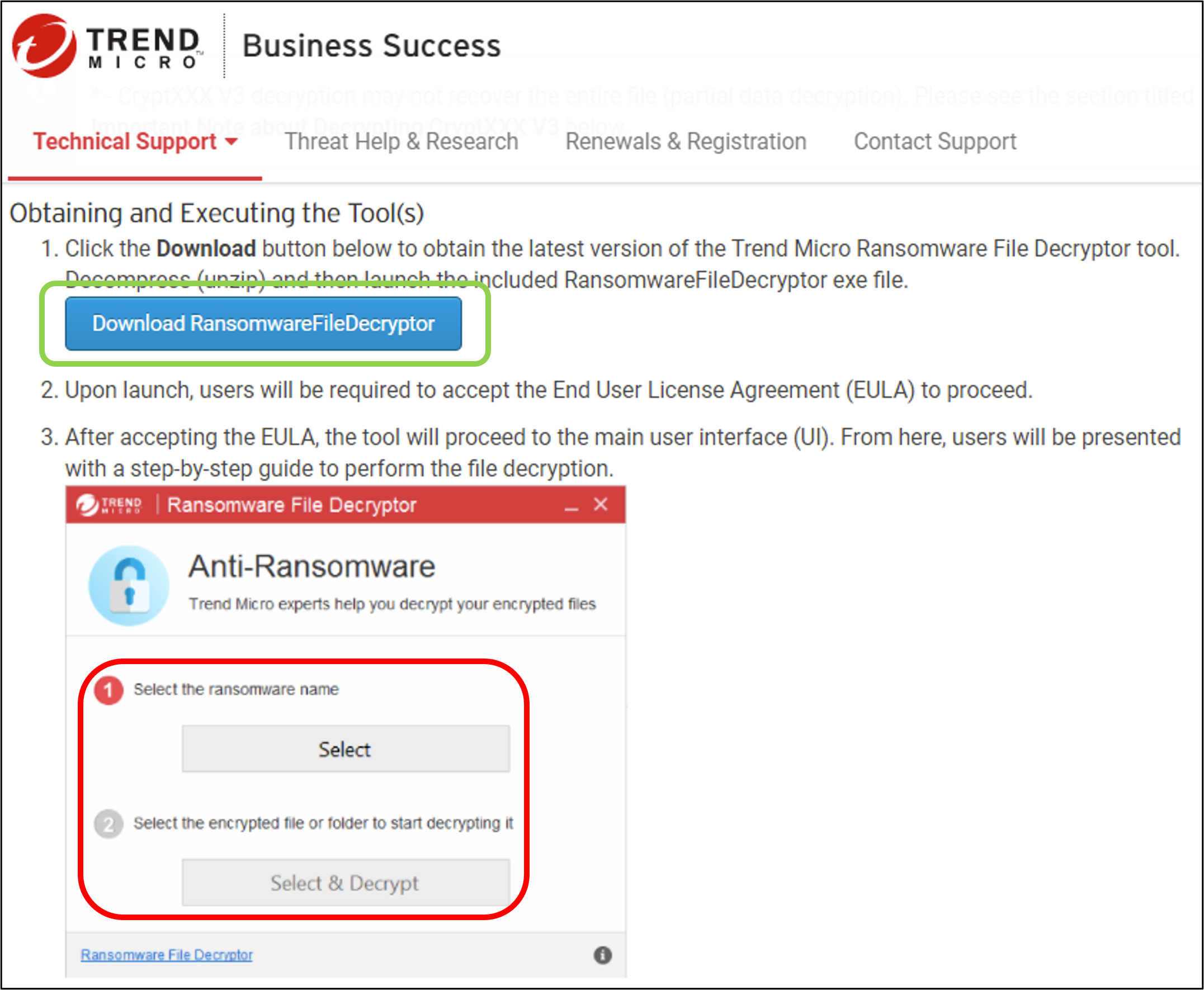 由Trend Micro 提供。使用者可下載 (綠框處)與執行RansomwareFileDecryptor工具,選擇勒索軟體名稱與欲解密的檔案或資料夾進行解密(紅框處)。頁面如圖8所示。