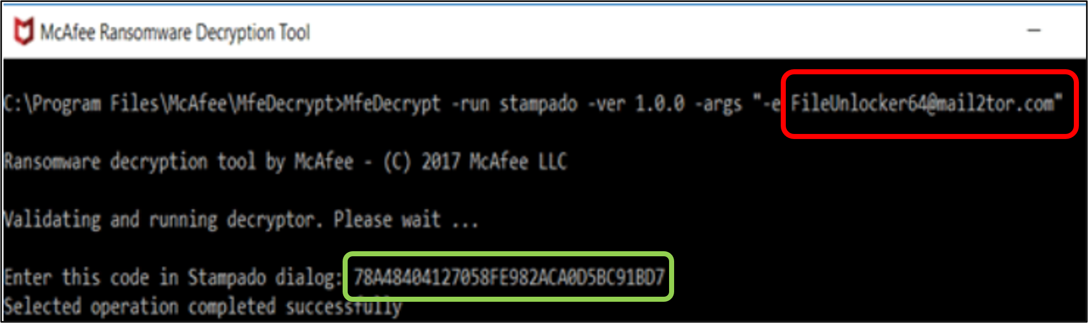 (d) 透過 ‘MfeDecrypt -run stampado -ver 1.0.0 -args “-e FileUnlocker64@mail2tor.com’命令執行解密工具(圖19紅框處),提供圖15紅框處的勒索聯絡電子郵件,取得解鎖碼(圖19綠框處),並於圖14的勒索訊息畫面輸入解鎖碼進行檔案解密。