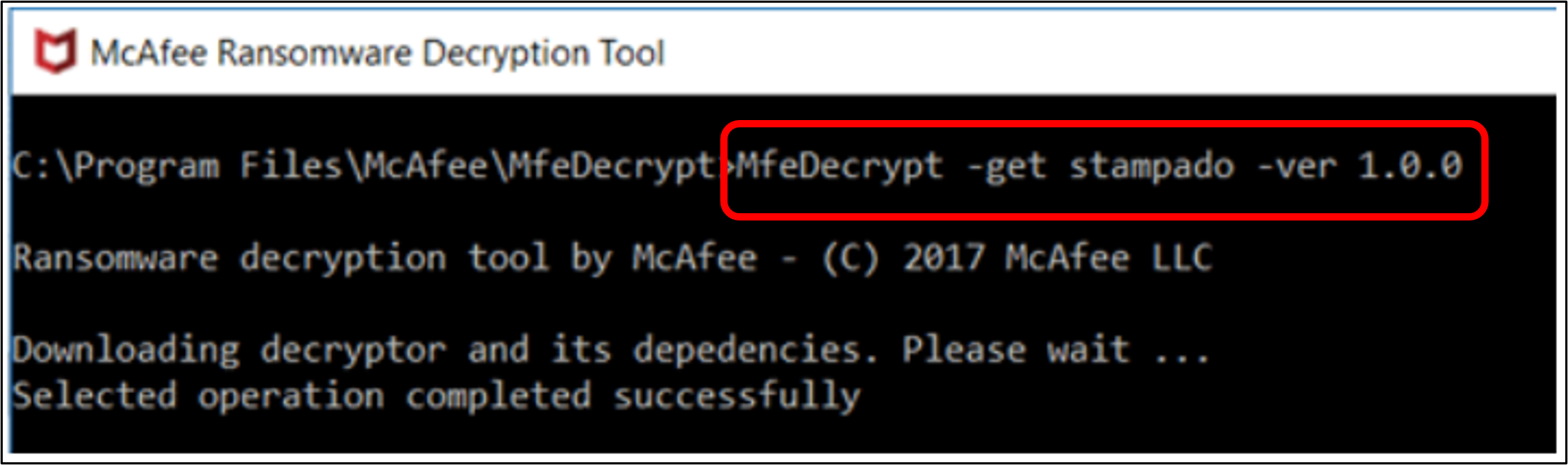 (b) 執行 ‘MfeDecrypt -get stampado -ver 1.0.0’指令下載Stampado 解密工具。(圖17紅框處)