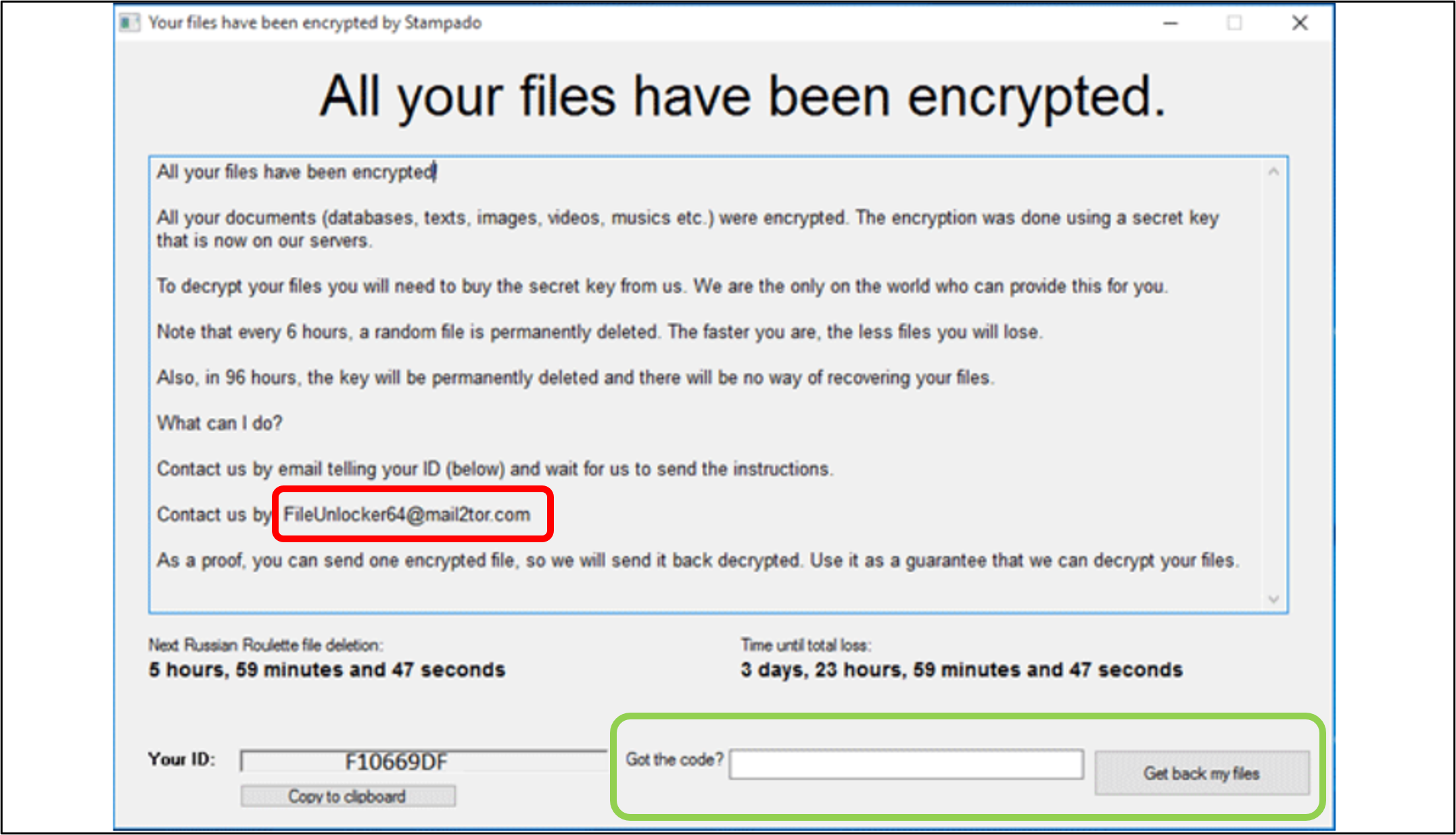 Stampado 勒索訊息如圖15所示,內容提示受害者需透過攻擊者電子郵件 (圖14紅框處)聯繫以取得解鎖碼輸入(圖15綠框處)進行檔案解密。