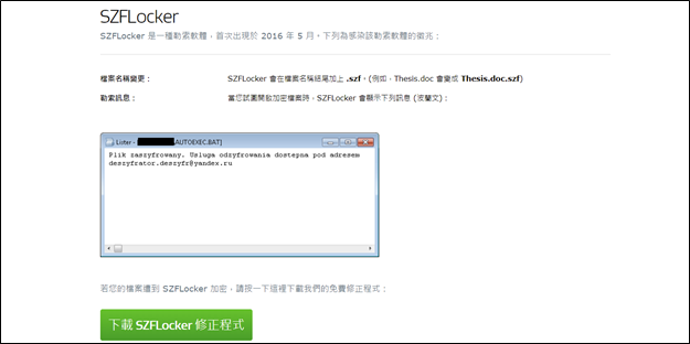 圖11、工具說明、勒索訊息畫面與修正程式下載連結 (示意圖)